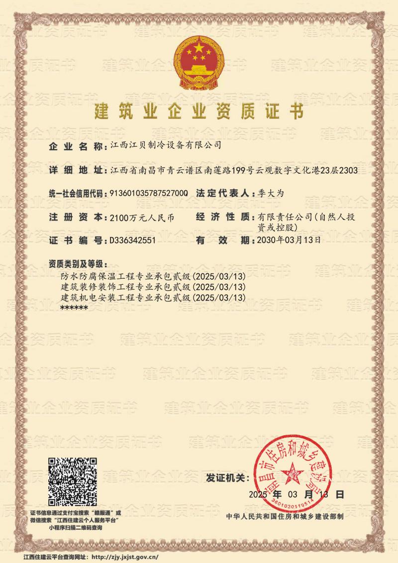 江貝冷庫安裝資質證書