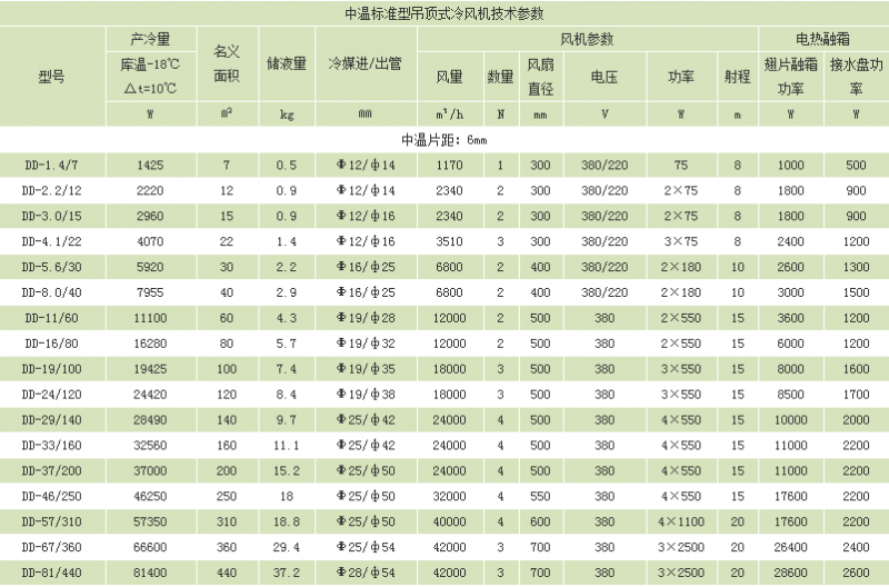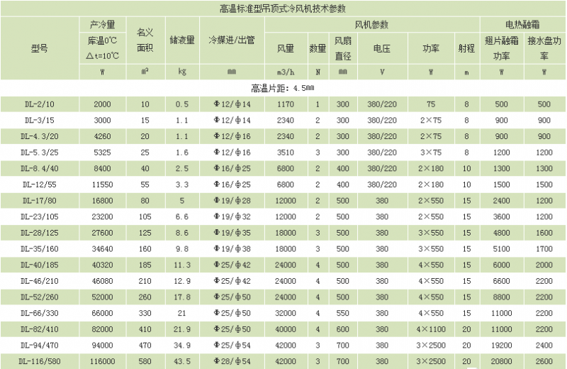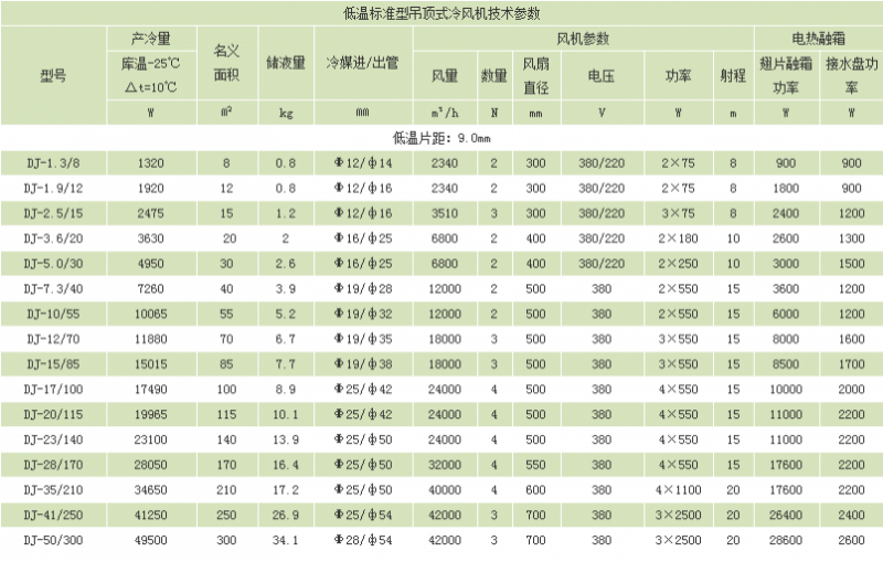 冷風機是一種配套于氟利昂制冷機組使用的庫內(nèi)冷卻降溫設(shè)備,按適用溫度來分,分為DL、DD、DJ、三種系列,可分別適用于不同的庫溫,DL型冷風機主要適用于0℃左右的保鮮庫;DD型冷風機主要適用于-18℃的冷藏庫,DJ型冷風機主要適用于-25℃以下的速凍庫  。